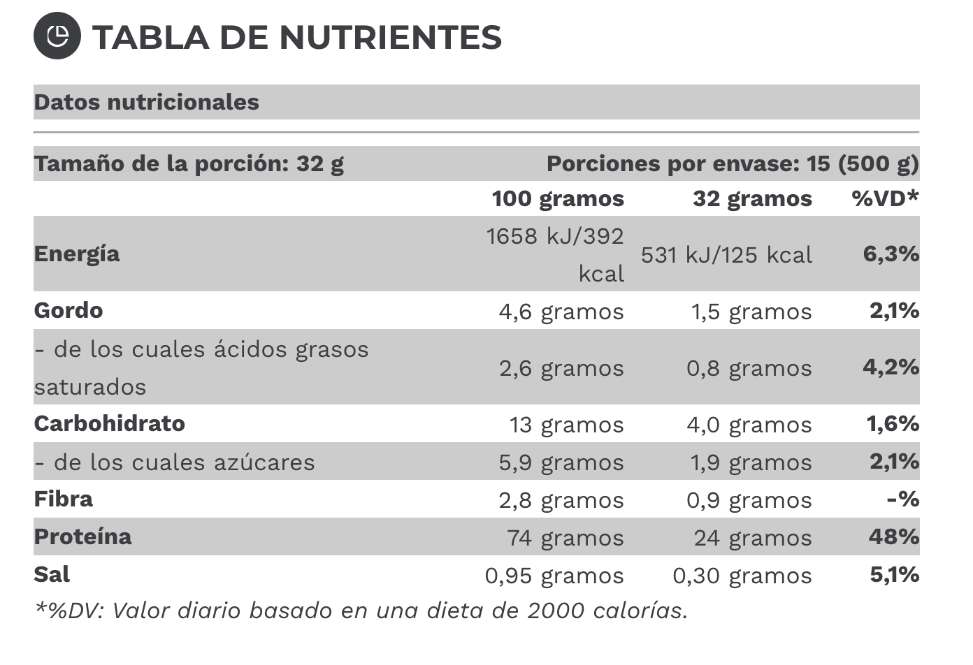 Lista de ingredientes (sabor chocolate): Concentrado de proteína de suero de leche instantáneo [ leche (emulsionante: lecitina de girasol)], concentrado de proteína de suero de leche ( leche ), glicina, leche desnatada en polvo, cacao en polvo bajo en grasa, maltodextrina, sabores (chocolate, crema), sal de mesa, espesante (goma xantana), L-taurina, L-glutamina, edulcorantes, complejo enzimático DigeZyme® (alfa-amilasa, proteasa neutra, celulasa, lactasa, lipasa).