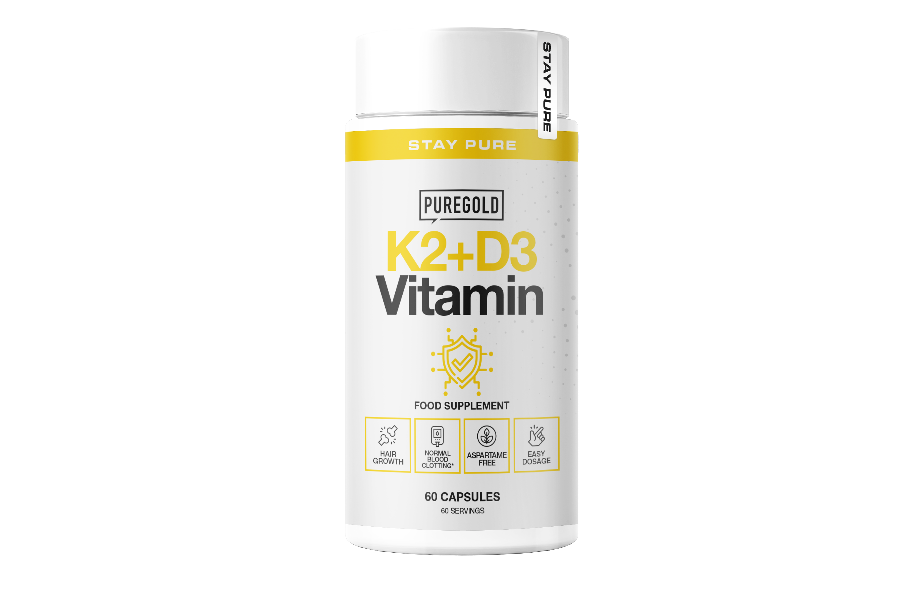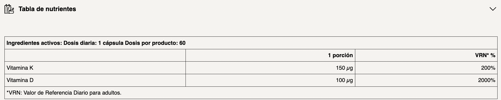 Cápsula de complemento alimenticio práctica y fácil de tomar con vitamina K y vitamina D.